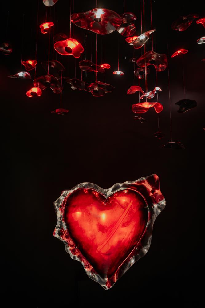 An archetypal symbol of love, friendship, and the endless bond between people transforms here into an object made of slumped and silvered glass, breathing with the rhythm of human energy. In the darkened space, a pulsating glass heart emerges, surrounded by floating fragments – a flow of thoughts and memories that never fade, but remain inscribed deep within us.