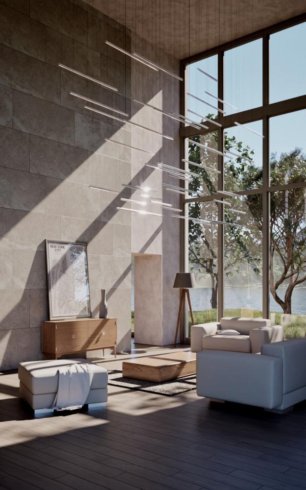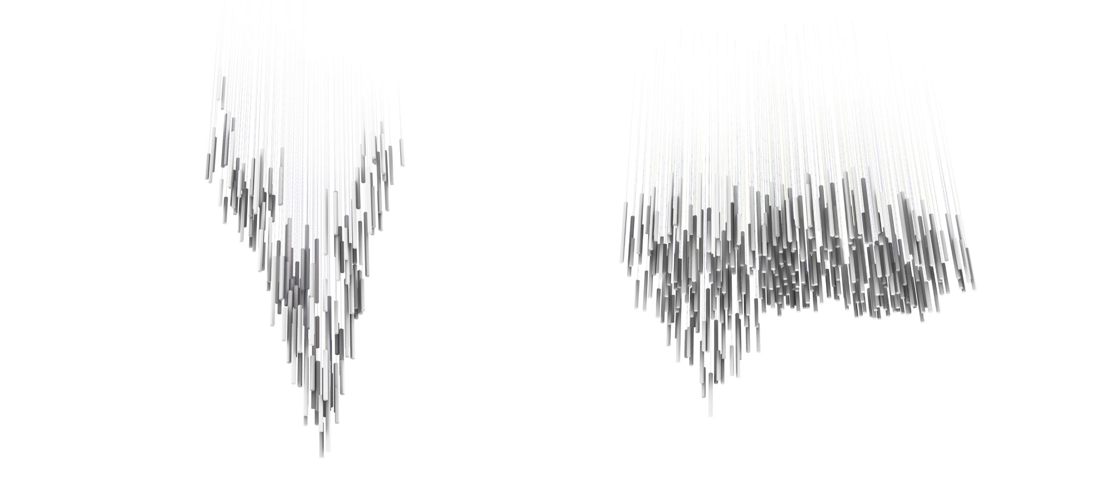 Streaming beams of light pierce through the midnight darkness, casting a mesmerizing glow. The fragmented allure of ice floes, seemingly on the verge of melting with each delicate touch. The Segmented Ice Rods installation offers a choice between pristine clarity or an intricate hand-cut design reminiscent of morning frost patterns.